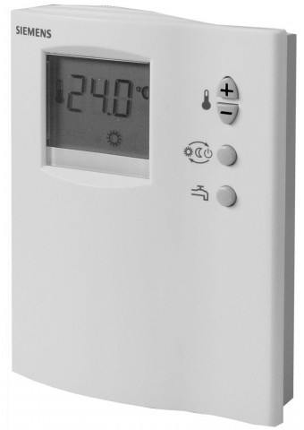 Einfacher elektronischer Raumtemperaturregler mit LCD und Warmwassersteuerung. Ersatzgerät RDD100.1DHW hat die gleiche Funktionaltität mit neuem Design, grosses LCD und Touch-Technologie